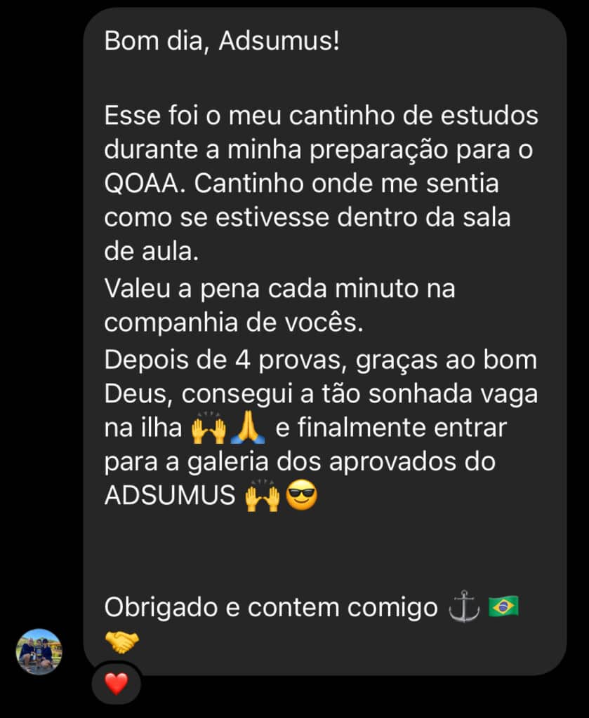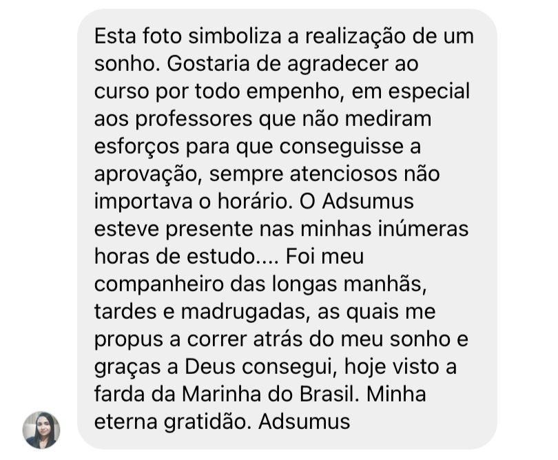 Nosso compromisso com a excelência nos levou a um feito notável: a quantidade de alunos que aprovamos é tamanha que a própria Marinha do Brasil nos honrou com a Medalha de Amigo da Marinha. Isso nos permite afirmar, com grande orgulho, que nenhum outro preparatório alcança o mesmo índice de aprovações que o Adsumus no concurso para Oficiais Auxiliares da Armada.