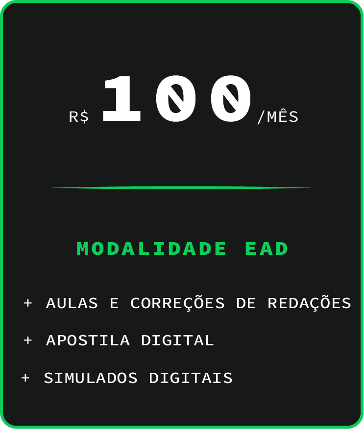 Para alunos EAD, dispomos de simulado interativo, podendo ser feito diretamente no sistema. Para os alunos que preferem uma experiência imersiva, também é disponibilizado o arquivo do simulado e do cartão resposta em PDF para impressão. O Gabarito fica disponibilizado em PDF e também a folha modelo para o envio da redação.