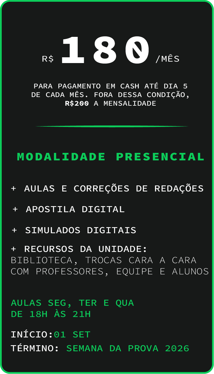 Para pagamentos das mensalidades do preparatório presencial em pix ou boleto, entre em contato com nossos canais oficiais, todo o procedimento será realizado diretamente com a secretaria.
